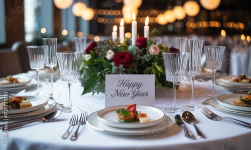 Festive dinner table setting with Happy New Year card