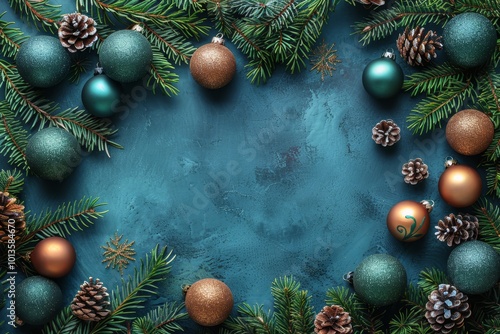 Festive fir tree branches with christmas baubles and snowflakes on a blue background, ideal for text