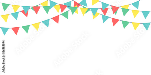 Festive flag garlands. Colored garlands of triangular flags. Carnival, birthday or party design decoration. Design of festive banner, greeting card. Vector illustration.