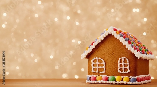 Festive gingerbread house adorned with colorful candies and icin