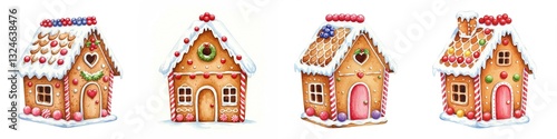 Festive Gingerbread Houses Winter Wonderland - Four charming gingerbread houses, decorated with snow, berries, and candy, symbolize holiday cheer, winter magic, sweet treats, home coziness