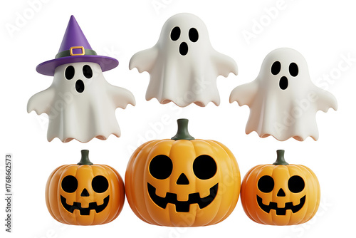 Festive Halloween decorations featuring pumpkins, ghosts, and a witch hat create a spooky atmosphere.