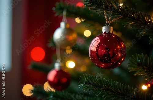 Festive holiday decorations with shimmering ornaments and warm lights