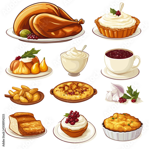 Festive Holiday Feast Illustration with Turkey and Traditional Dishes