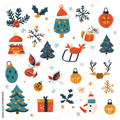 Festive holiday pattern of Christmas trees, ornaments, and snowmen on white