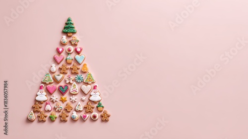Festive holiday treats forming a Christmas tree on a pink background.