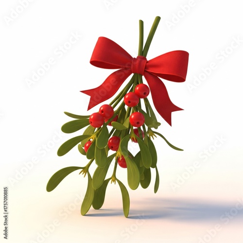 Festive Mistletoe Bunch with Red Bow on White Surface with Soft Lighting