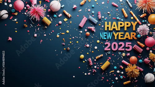 Festive New Year 2025 celebration with colorful confetti, balloons, and decorations on dark background, creating joyful and vibrant atmosphere