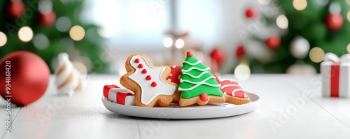Festive plate of decorated Christmas cookies with holiday decorations in the background
