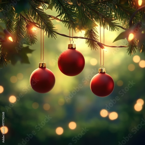 Festive red ornaments hang from a lush evergreen branch, illuminated by soft glowing lights, creating a warm holiday ambiance.