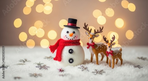 Festive snowman and deer figurines on snow with bokeh lights