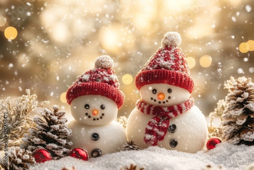 Festive snowmen wearing knitted hats with red accents in a snowy winter landscape during the holiday season