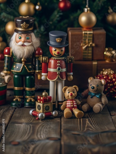 Festive Vintage Toy Collection. A charming and festive scene with a traditional nutcracker doll, a teddy bear toy, and a wooden toy train, all set against a backdrop of Christmas decorations.