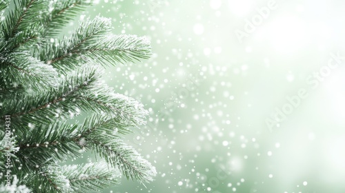 Festive Winter Background Frosted Evergreen Branches with Sparkling Snowfall and Bokeh.