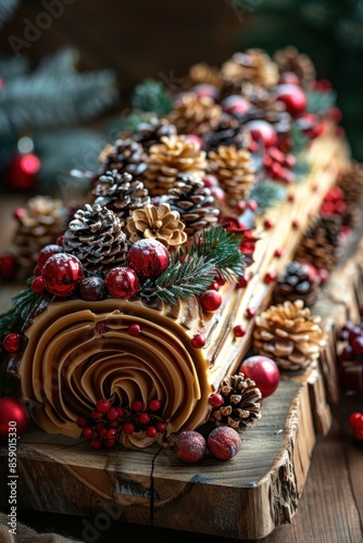 Festive Yule Log Cake Decorated with Pine Cones and Berries