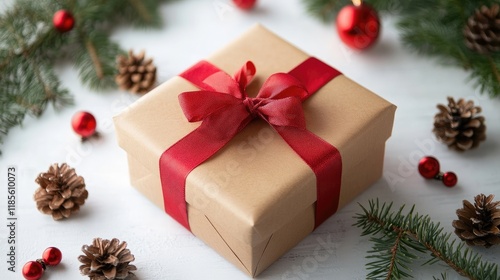 Festively wrapped gift box with red ribbon surrounded by pine cones and ornaments on a white background for holiday theme decorations.