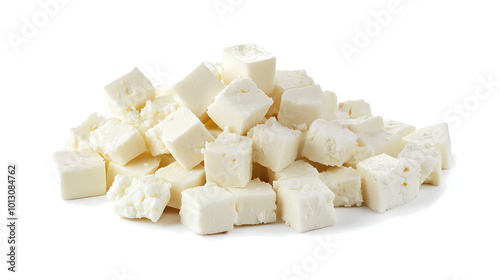 Feta cheese bundle, cut in cubes, isolated on a white background