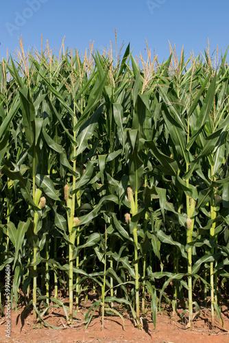 Field cultivated with maize (Zea mays) on a large scale, in the flowering phase.