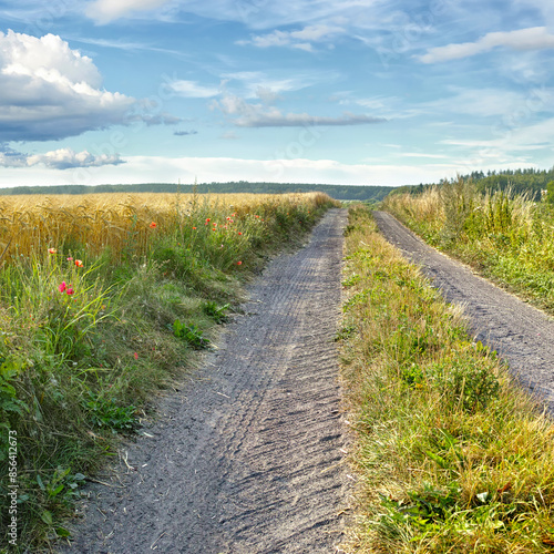 Field, wheat and street in outdoor nature, agriculture and cloudy sky for harvesting in farm. Plants, road and grain production in countryside landscape, growth and ecosystem for sustainability