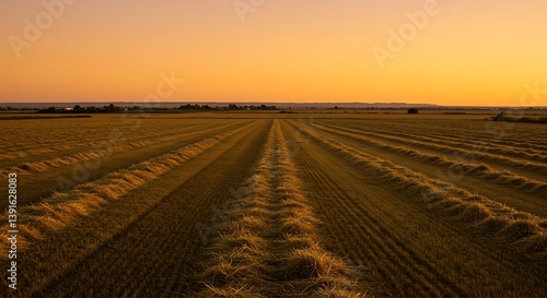 Fields of Wheat at Sunset with Warm Colors and Agricultural Landscape