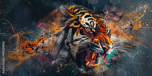 Fierce Tiger with an Explosion of Colors, Displaying Raw Power and Authority in a Striking Image.