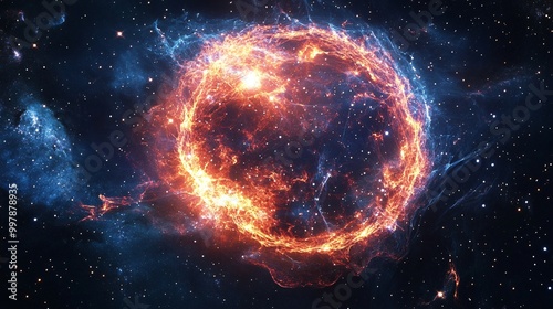 Fiery cosmic nebula with swirling gas and stars in a dark space.