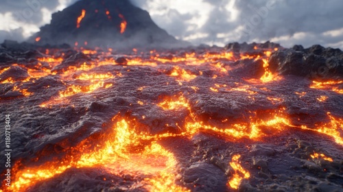 Fiery Eruption of Molten Lava Flowing Through Rocky Landscape
