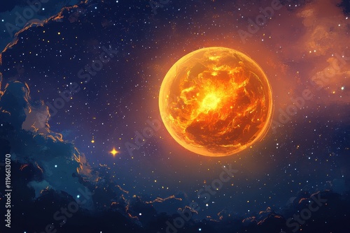 Fiery Planet Glowing Brightly In Deep Space Among Stars