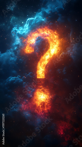 Fiery question mark emerging from vibrant clouds, symbolizing mystery and curiosity in a cosmic scene