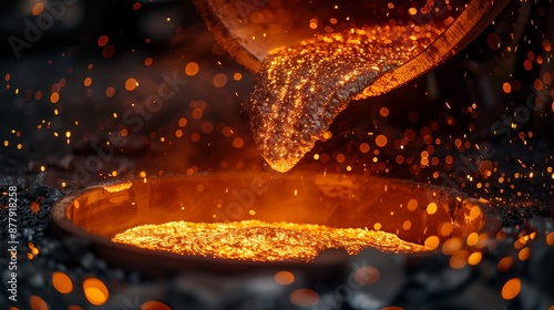 Fiery Stream Of Molten Metal Pouring Into Mold With Intense Heat And Glow Suitable For Manufacturing, Metalwork, And Foundry Concepts
