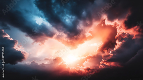Fiery Sunset Explodes Through Dramatic Cloudscape: Wide Shot Photo. AI Generated