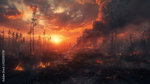 Fiery Sunset Over a Burning Forest Landscape