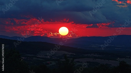 Fiery sunset over mountain range.