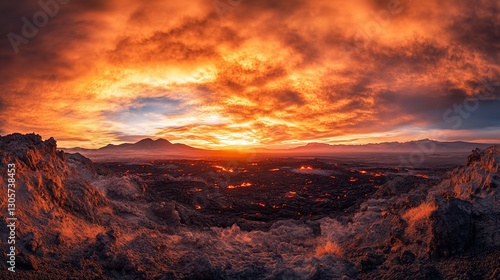 Fiery sunset over volcanic landscape with glowing lava field.