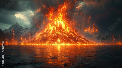 Fiery volcanic eruption reflected in dark water.