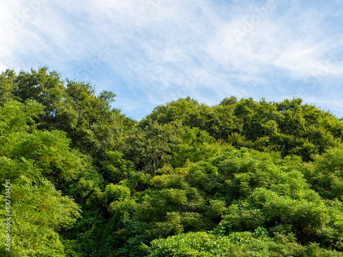 青空と新緑に覆われた山