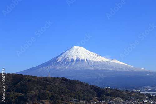 冬の冠雪した富士山と青空