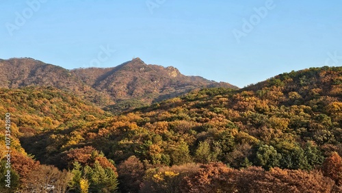 가을에 빨갛고 노랗게 물든 나무와 하늘이 보이는 자연경관
