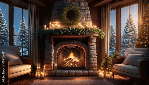 石の暖炉で薪が燃え、暖かな光が部屋を照らす。クリスマスのリースとキャンドルが飾られ、冬の夜の穏やかな雰囲気。窓からは雪が降り積もり、静かな時間が流れる冬の部屋です。
