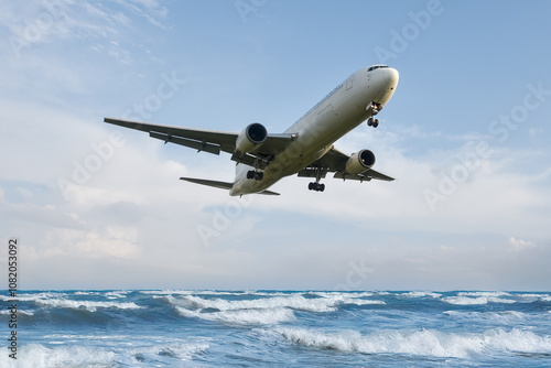 青い空、海の上を飛ぶ飛行機