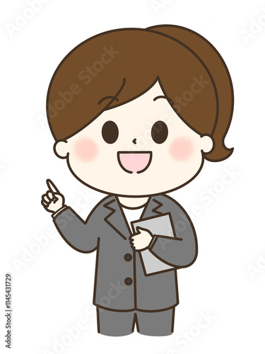 指差ししているパンツスーツの女性のゆるかわイラスト