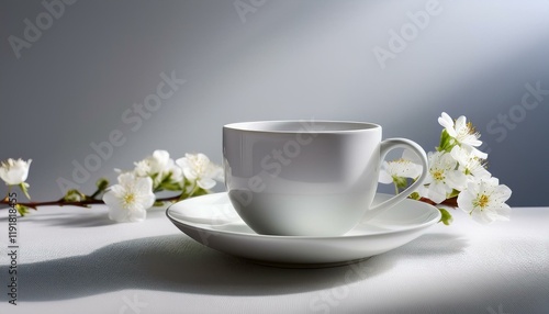 春の清々しい空気を感じる薄いグレーからホワイトのグラデーション背景に、白いカップが穏やかに佇む