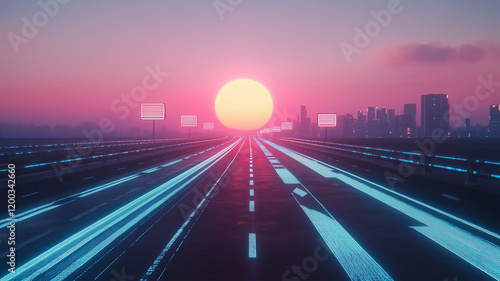 サイバーパンク風に発光する高速道路が描く未来の夜明け