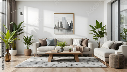 モダンでスタイリッシュなリビングルーム居心地の良いソファ、コーヒーテーブル、緑の植物、ラグ、装飾的な要素