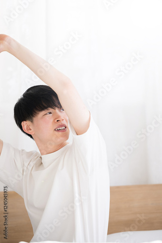 朝日を浴びるベッドで寝起きで見上げるの若い男性 腕を伸ばすストレッチをするクローズアップ 右にコピースペースあり 縦