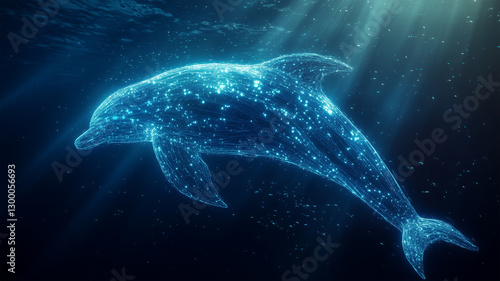 ディープブルーの海に浮かび上がるホログラムのイルカが描く幻想的な未来世界
