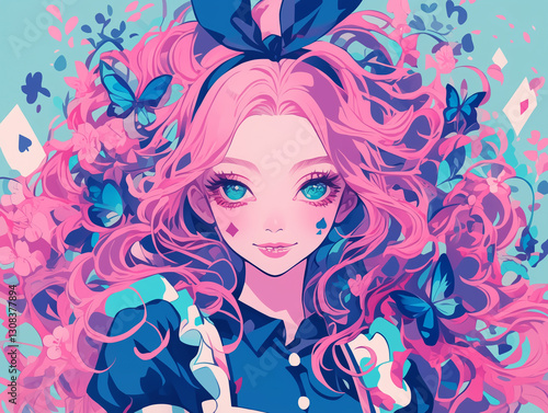 アニメ風ポートレート ピンク髪のアリス風少女が見つめる