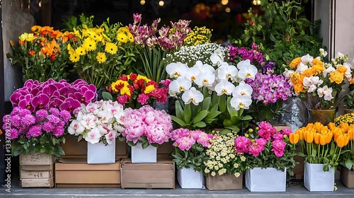 色とりどりの花が並ぶ美しい花屋のディスプレイ