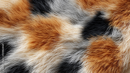 ふわふわの毛並みと自然な三色模様が印象的な長毛ファー|動物系デザインや優しい背景素材として最適