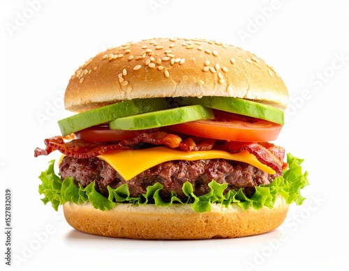 アボカドとベーコン入りのボリューム満点ハンバーガー 白背景